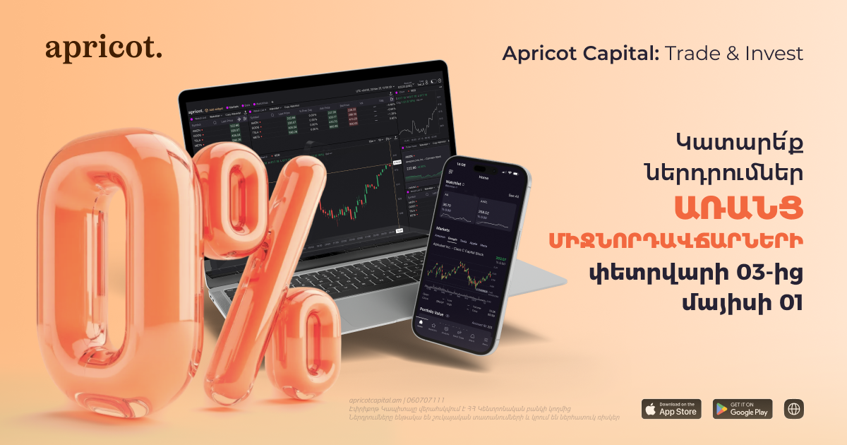 Մեր Apricot Capital: Trade & Invest առևտրային նոր հարթակի գործարկման կապակցությամբ իրականացնում ենք հատուկ խրախուսական արշավ նոր հաճախորդների համար։ Արշավի շրջանակում կարող եք մեր հավելվածով գնել և վաճառել բաժնետոմսեր ու ETF-ներ ԱՄՆ շուկայում՝ առանց միջնորդավճարների։
