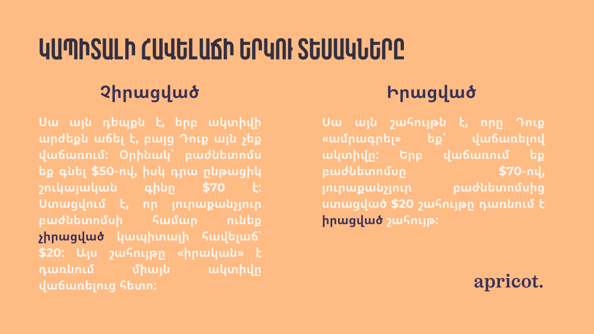Կապիտալի հավելաճն այն եկամուտն է, որը ստանում եք՝ վաճառելով որևէ ակտիվ (գույք, ֆինանսական գործիք, և այլն) ավելի բարձր գնով, քան այն ձեռք էիք բերել։