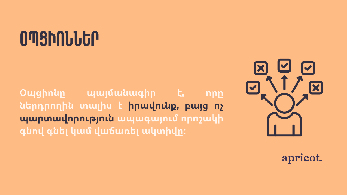 Օպցիոնը պայմանագիր է, որը ներդրողին տալիս է իրավունք, բայց ոչ պարտավորություն ապագայում որոշակի գնով գնել կամ վաճառել ակտիվը։