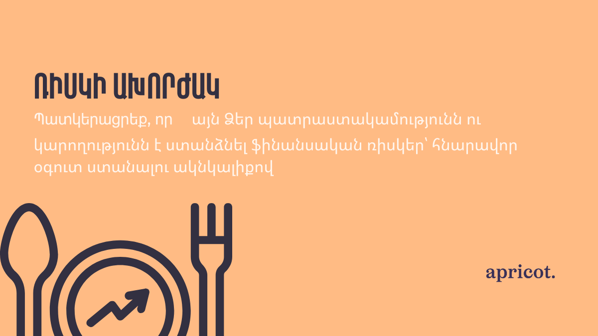 Շարունակում ենք «Էփրիքոթի հետ ներդրողի բառարան» շարքում փորձառու և սկսնակ ներդրողների համար կարճ և հասանելի ձևով ներկայացնել ոլորտի տերմինները: Այս հոդվածում կխոսենք ներդրողների համար շատ կարևոր մի հասկացության՝ ռիսկի ախորժակի մասին: Ճիշտ այնպես, ինչպես որոշ մարդիկ նախընտրում են կծու սնունդ, իսկ մյուսներն՝ առանց համեմունք, ներդրողները նույնպես ունեն ռիսկի նկատմամբ տարբեր ախորժակ։ Ձեր ռիսկի ախորժակը հասկանալը կարևոր է, որպեսզի Ձեր ներդրումները համապատասխանեն և համահունչ լինեն Ձեր ֆինանսական նպատակների հետ: