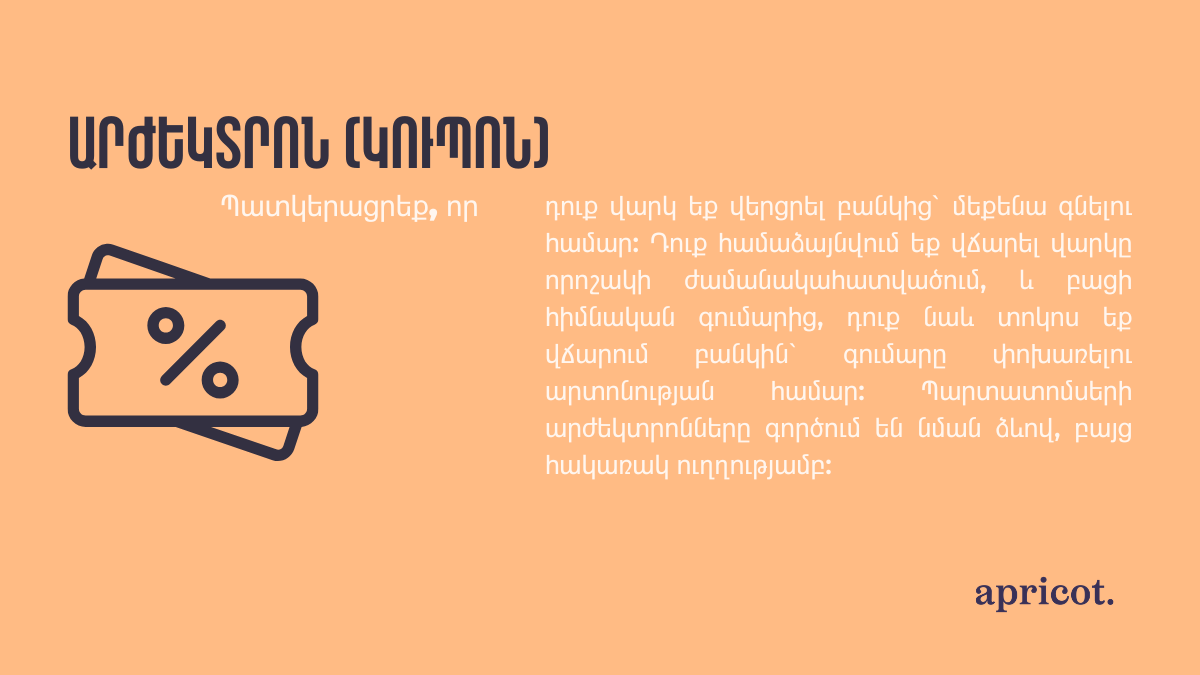 Շարունակում ենք «Էփրիքոթի հետ ներդրողի բառարան» շարքում փորձառու և սկսնակ ներդրողների համար կարճ և հասանելի ձևով ներկայացնել ոլորտի տերմինները: Նախորդ հրապարակումներում ուսումնասիրել ենք արժեթղթերի աշխարհը, ներառյալ բաժնետոմսերն ու պարտատոմսերը: Գիտեի՞ք, որ պարտատոմսերը կարող են Ձեզ ապահովել եկամտի կանոնավոր հոսքով: Այսօր մենք կանդրադառնանք պարտատոմսերի այս կարևոր բաղադրիչին՝ արժեկտրոնին: