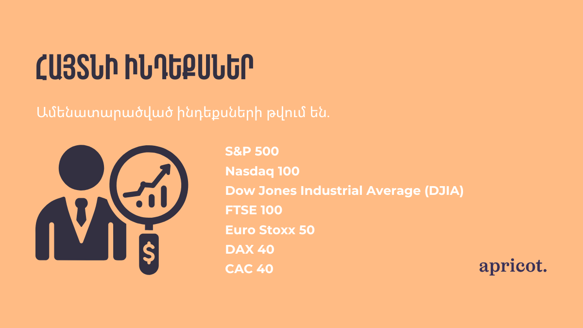 - S&P 500 | Հետևում է ԱՄՆ 500 խոշոր ընկերությունների կատարողականին, որոնք կազմում են ԱՄՆ ֆոնդային շուկայի ընդհանուր կապիտալիզացիայի մոտ 80%-ը։