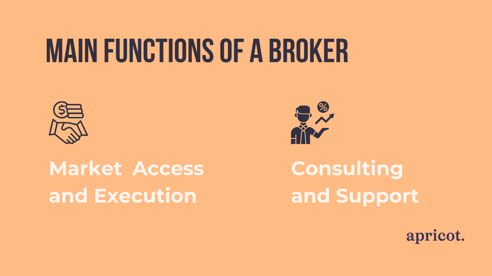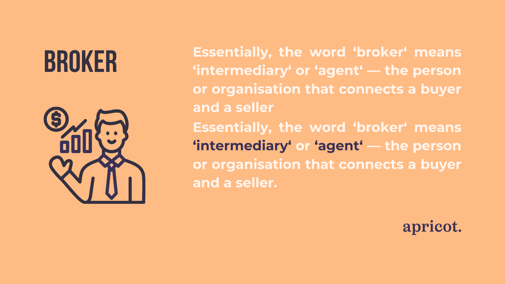 Essentially, the word ‘broker‘ means ‘intermediary‘ or ‘agent‘ — the person or organisation that connects a buyer and a seller. This term is often used across various fields, including real estate, logistics and insurance. In this article, however, we are discussing financial brokers. A financial broker, such as Apricot Capital, acts as an intermediary between investors and the financial markets.