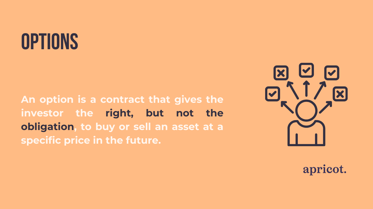 An option is a contract that gives the investor the right, but not the obligation, to buy or sell an asset at a specific price in the future.